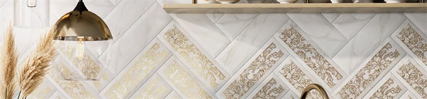 Керамическая плитка «Дорато». Набор настенной плитки “кабанчик” с рисунком мрамора, матовой поверхностью и структурой “диамантато”. Белый цвет базы разнообразится декором, выполненном в легком цветочном мотиве. Своей графичностью он напоминает сделанный золотистым карандашом архитектурный набросок. Серия вдохновлена золотой росписью зала Дорато в миланском музее Польди-Пеццоли и прекрасно подойдёт для светлого интерьера в классическом стиле. Отлично сочетается с напольным покрытием из керамического дерева или мрамора.