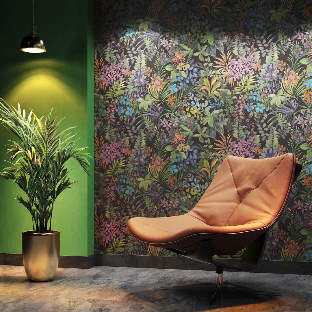 Дизайнерские обои передают колорит тропического леса. Богатая цветовая палитра, сочные и нежные оттенки, тиснение – выделяется каждый лепесток. Бархатистая мелкая текстура, зелень, будто живая. Все это делает спальню или гостиную уютной, «приятной на ощупь» и эффектной на вид. Фоновые обои однотонные. Фактура напоминает мрамор или поверхность штукатурки с матовым покрытием.