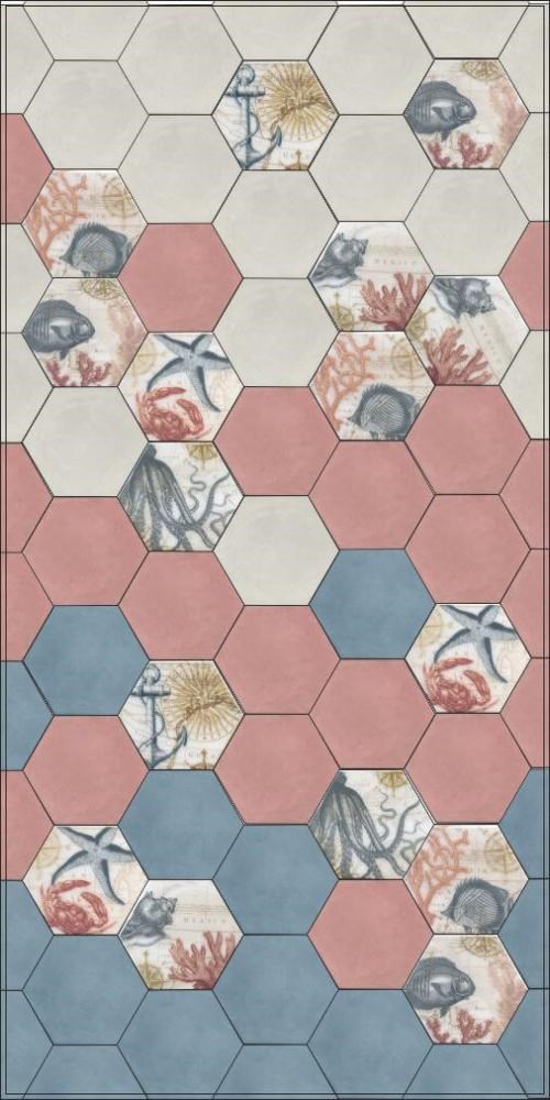 Керамическая плитка «Эль Салер». Шестиугольная настенная плитка в современном стиле. Глянцевая поверхность с текстурой мрамора и бетона в мягкой бело-розово-голубой гамме создаёт атмосферу солнечного заката на морском берегу. Шесть декоров, вдохновлённых морскими странствиями, выполнены с эффектом объемного изображения. Поверх керамики нанесён прозрачный слой гранили, блеск которой усилен золотым свечением и перламутровыми вставками. Благодаря этому картины подводного мира выглядят ярко и живо.