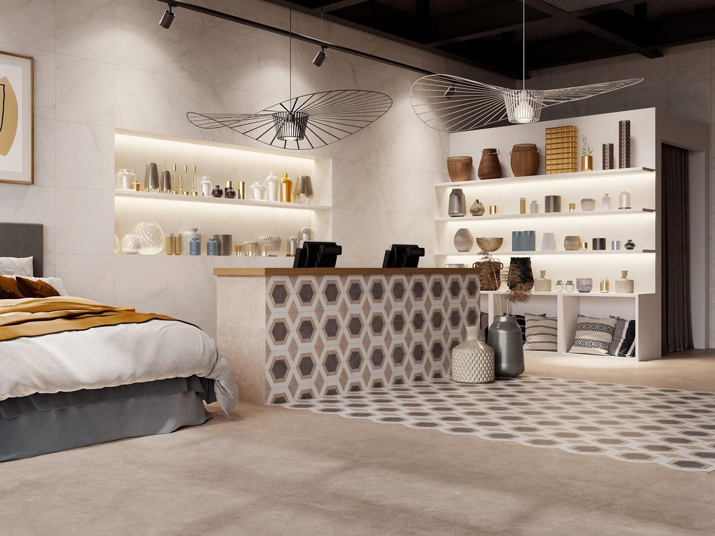 Керамическая плитка и керамический гранит «Гран Пале». Материал с глянцевой поверхностью воспроизводит текстуру мрамора в белом, бежевом и сером цветах. Универсальность делает его подходящим для оформления интерьеров в различных стилях, от классических до современных, а относительно компактный формат упрощает укладку в небольших помещениях, например, в санузлах, ванных комнатах, кухнях. Разнообразить композицию помогут декоративные элементы, в частности наборный декор с геометрическим узором в цветовой гамме базовой плитки.