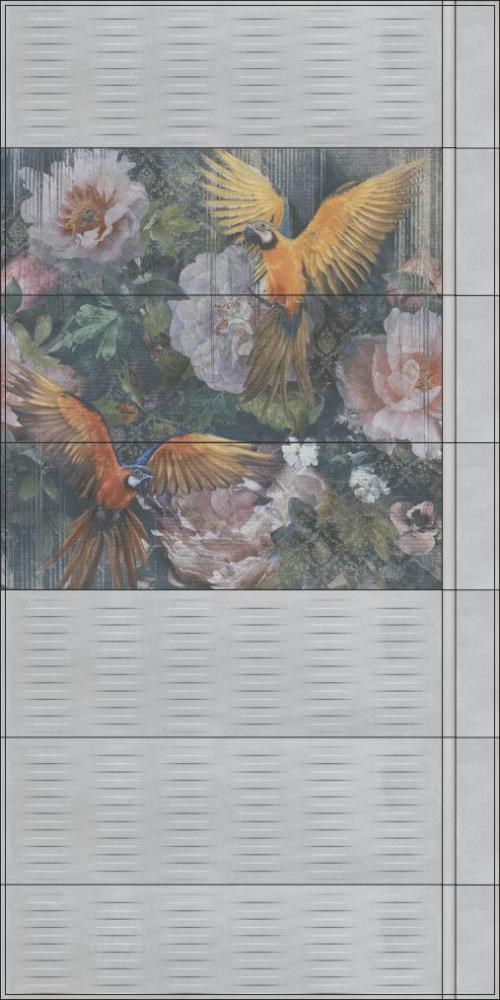 Керамическая плитка «Раваль». Крупноформатная матовая плитка в современном стиле. Поверхность имитирует текстуру металла, а декор дополняет её рельефным геометрическим узором в виде стальных стяжек с заклёпками. Использование настоящего металла в покрытии придаёт картине совершенную реалистичность. В серию входят два панно-триптиха: силуэт быка в монохромном исполнении и яркий тропический сюжет, добавляющий в строгий интерьер нотки смелой эклектики.