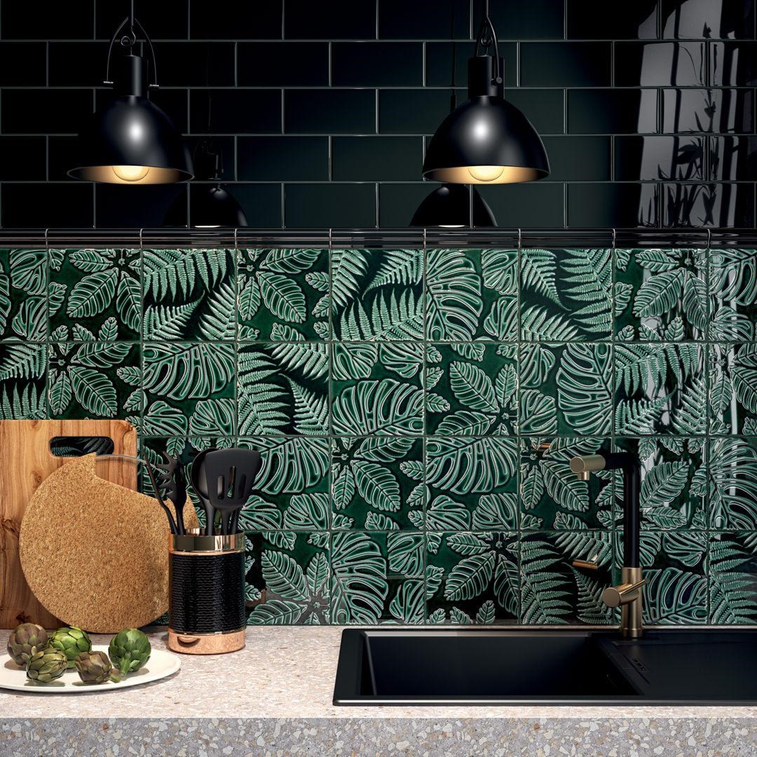 Керамическая плитка «Сантана». В серии образ и атмосфера деревушки на севере Мадейры. Вся в густых тропических зарослях в самом сердце заповедных земель. На полотне из декоров с объёмным рисунком, словно плетут ковер лианы. Разворачивают к солнцу свои сочные резные листья. Фоновая изумрудная плитка дополняет тропический сюжет. Блестящая глазурь на поверхности подчеркивает глубину цвета. Добавляет реалистичности объемному рисунку на декорах.