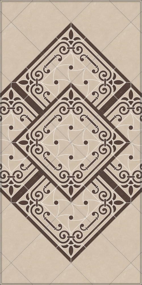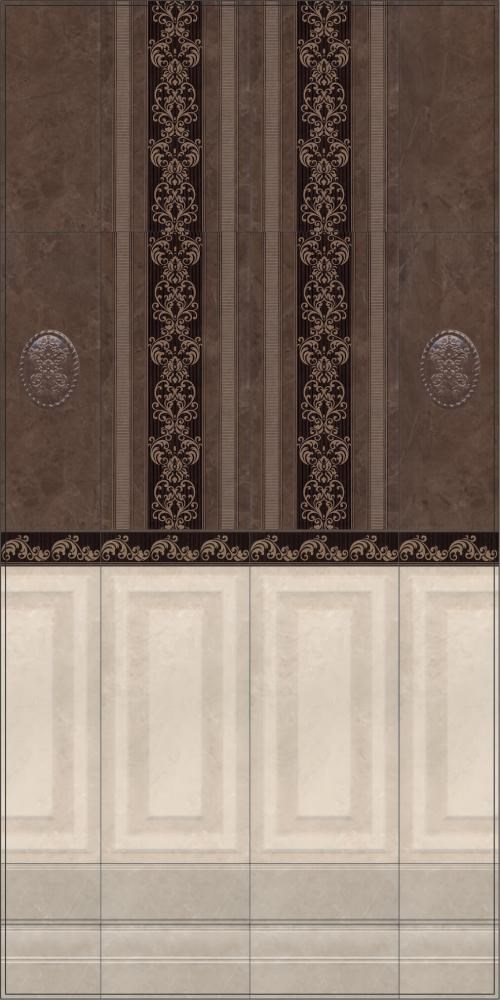 Керамическая плитка «Версаль». Настенная керамическая плитка с глянцевой поверхностью, имитирующей текстуру мрамора, в бежевом и коричневом цветах. Крупные декоративные элементы украшены благородным орнаментом, который в сочетании с мраморным фоном создаёт атмосферу изящества и аристократизма. В серию входят вставочные мозаичные декоры, а также светлый наборный керамический ковёр, который может выступить в роли настенного панно или центрального элемента напольной укладки.